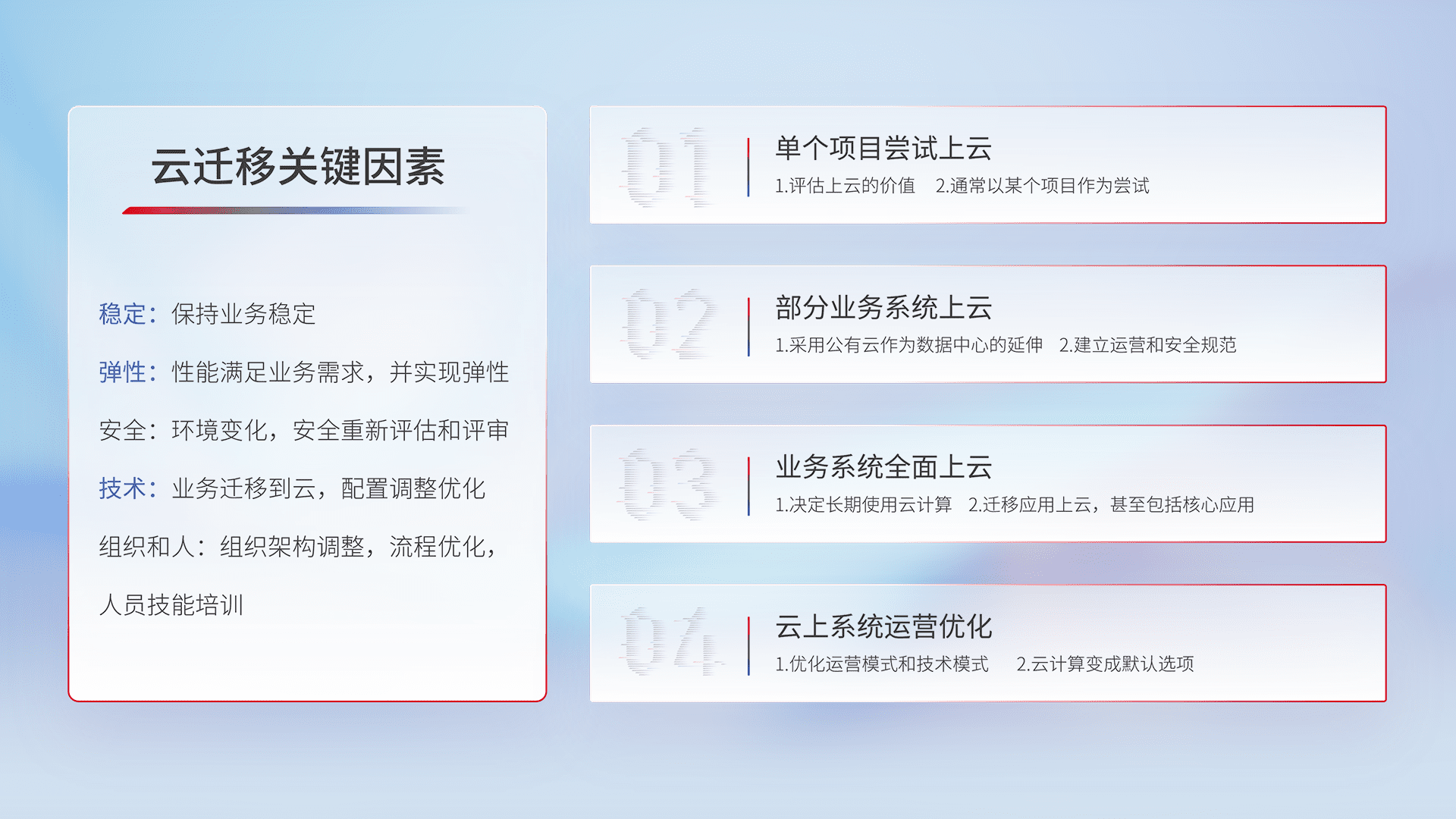 结合实际业务,,从规划设计、、、云平台选型、、、云原生改造、、、数据迁移、、、集成交付,,,,迁移全过程为客户识别最佳上云路径,,,做好风险识别管理,,设计网络架构、、、身份权限、、安全审计合规、、、操作审计、、、、日志审计、、监控告警策略、、、多站点容灾设计等,,,,对云上基础设施进行整体规划,,,,提升IT治理水平,,,,以满足弹性、、、高可用、、高性能的需求。。。