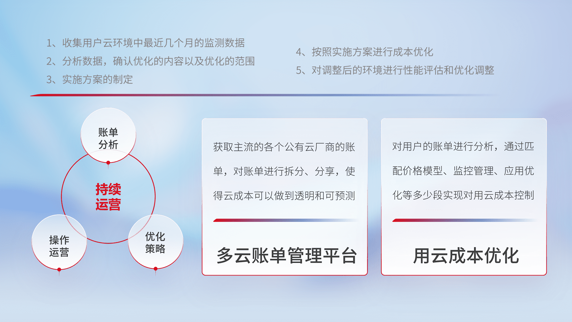 通过多云纳管,,,,以统一的资源数据模型把客户的云资源进行抽象和封装,,进而实现对多云资源的统一操作,,,,保障云资源管理的可靠性、、稳定性与可用性。。量身定制化运维内容,,,,配置、、开发运维、、补丁管理、、、、备份、、、、监控、、认证和访问管理、、、审计和日常巡检等,,,保障在用云过程中的可靠度,,,,稳定度以及高可用率。。
